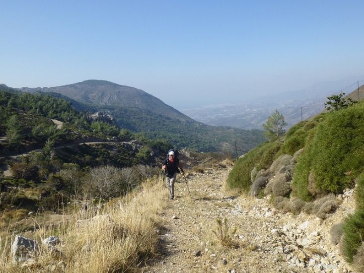 Nachdem wir unsere Wasserflaschen am Dorfbrunnen in Vasiliki gefüllt haben, überqueren wir das Tal und steigen durch den noch schlafenden Ort Monastiraki am Rande der Schlucht bergauf. Auf schönen Pfaden mit atemraubenden Blicken auf das blaue Meer gewinnen wir rasch an Höhe und gelangen durch duftende Kiefernwälder in den Bergort Tripithi.