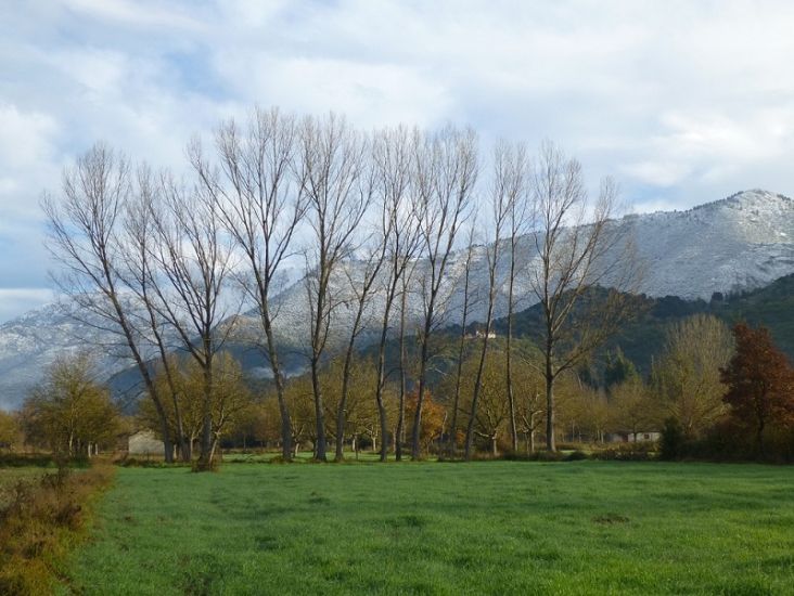 In der Nacht ist in den Bergen etwas Schnee gefallen. Aufgrund der unklaren Wegverhältnisse auf dem E4 gehen wir auf Nummer sicher und entscheiden wir uns für die Fortsetzung im Tal. Hier gehen wir durch unerwartet schöne Alleen, die mit herbstlichen Walnussbäumen und Platanen eingesäumt sind.