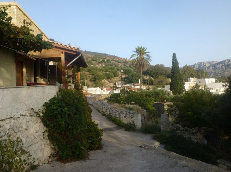 Wir gehen bergab in den Ort Epano Episkopi, in welchem leider ebenfalls kein Kafenion vorhanden ist. Die nun folgende Durchquerung des Tals mit einem wilden Canyon ist eine Herausforderung, denn es ist nicht leicht, einen Ausgang aus dem dschungelähnlichen Bachauen-Gestrüpp zu finden. Wir werden aber fündig und gehen durch Olivenhaine wieder aufwärts in das schön gelegene Dorf Sandali.