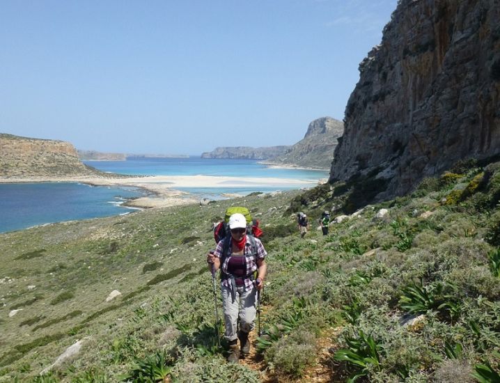 Entgegen den Zusicherungen unserer griechischen Freunde im Hotel in Kissamos gibt es keinen markierten Fußpfad, sondern nur ein Netz wirrer Ziegenpfade. An einem gefährlichen Steilabhang ist unser Ausflug zu Ende. Wir gehen zur Bucht zurück und wandern ab dem Parkplatz von heute Vormittag auf derselben Feldstraße nach Kaliviani und nächtigen dort.