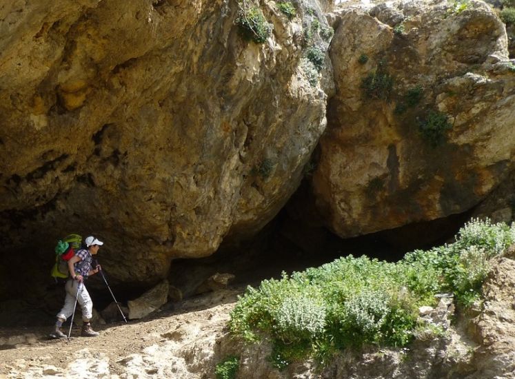 Wir steigen auf der Ebene von Falasarna an die Straße nach Sfinari hinauf. Einmal passieren wir die unter riesigen Felsblöcken versteckten, schattigen Ruheplätze der Ziegenherden. Kurz darauf treffen wir auf den offiziellen E4-Weitwanderweg von Kreta, welcher leider hier im Westen der Insel, bedauerlicherweise fast immer an der Teerstraße entlang führt.
