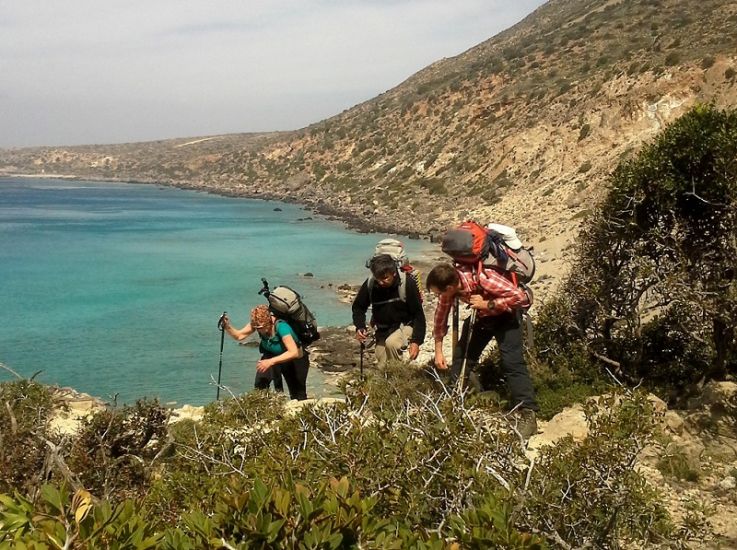 Nach dem Aufbruch in Elafonissi, auf dem E4-Fernwanderweg, sind wir starken Windböen ausgesetzt, die uns an der Steilküste arge Probleme bereiten. Nachdem keine Alternativen zu diesem Weg vorhanden sind, beschließen trotz dieser Widrigkeiten die Fortsetzung auf diesem Wanderweg. Allerdings müssen wir vor jedem heftigen Windstoß in Deckung gehen, was für einen Zuschauer wohl ziemlich lustig aussehen würde.