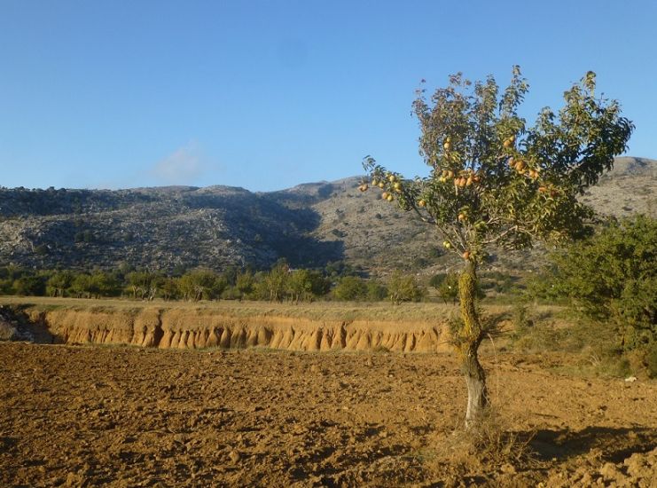 Oben angelangt kommen wir in eine schöne Hochebene mit Rebfeldern und Obstbäumen. Im Hauptort hat noch eine Taverne geöffnet und wir erhalten ein üppiges Abendmahl nebst Raki. Zimmer gibt es hier zwar keine, aber wir können im Nachbarhaus geschützt vor Regen und Kälte auf einigen Decken schlafen.