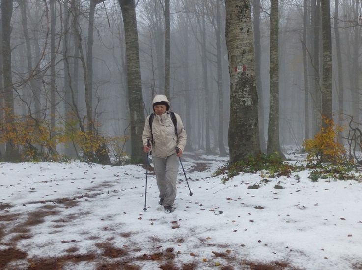 Durch die Sila Grande folgen wir einem kleinen, steil ansteigenden markierten Weg mit der Bezeichnung „422“. Wie angekündet, beginnt es zur Mittagszeit zu regnen. Erst in über 1800 Metern, kurz vor dem Gipfel der Sila-Region, erreichen wir wieder einen befestigten Weg, über welchem wir aber durch unangenehmen, nassen Schnee marschieren müssen.
