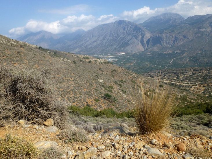 Wir befinden uns an jener Stelle auf Kreta, wo sich Nord- und Südküste sehr nahe kommen, die sogenannte Wespentaille. Von hier sehen wir schon einmalige Monastiraki-Schlucht, deren Eingang wie ein geöffneter Mund in der Bergflanke aussieht.
